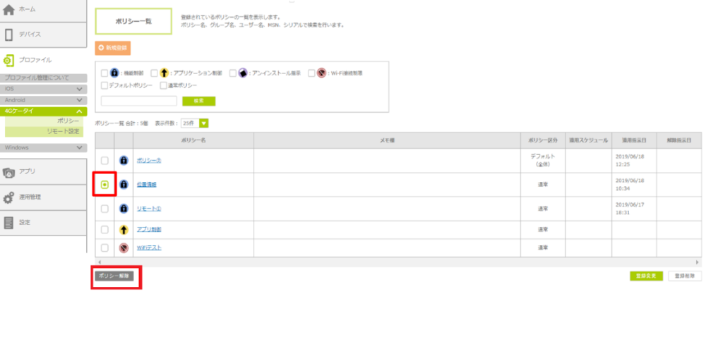 ここでは、不要になったポリシーをデバイスから解除する方法と、管理サイトから削除する方法を説明します。