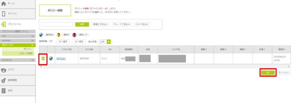 3.ポリシーを解除したいデバイスを選択し、「OK」ボタンをクリックします。