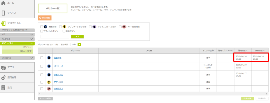 1.「ポリシー一覧」画面で、該当ポリシーの「適用指示日」および「解除指示日」に、ポリシーを解除した日時が表示されていることを確認します。