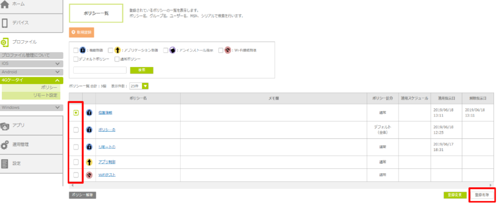 2.削除したいポリシーを選択し、「登録削除」ボタンをクリックします。