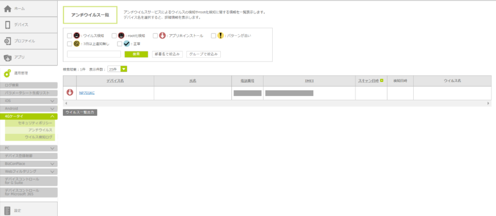 「アンチウイルス画面」を表示して、登録されている全てのデバイスのウイルス検知の情報を一覧表示します。