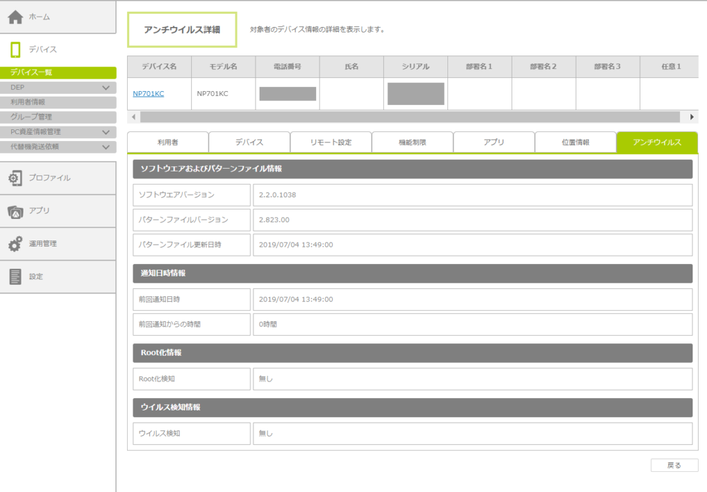 「アンチウイルス画面」でデバイス名をクリックすると、デバイスに関する詳細情報が表示されます。