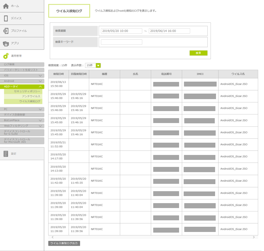 1. 「運用管理」をクリックし、「4Gケータイ」-「ウイルス検知ログ」の順にクリックします。