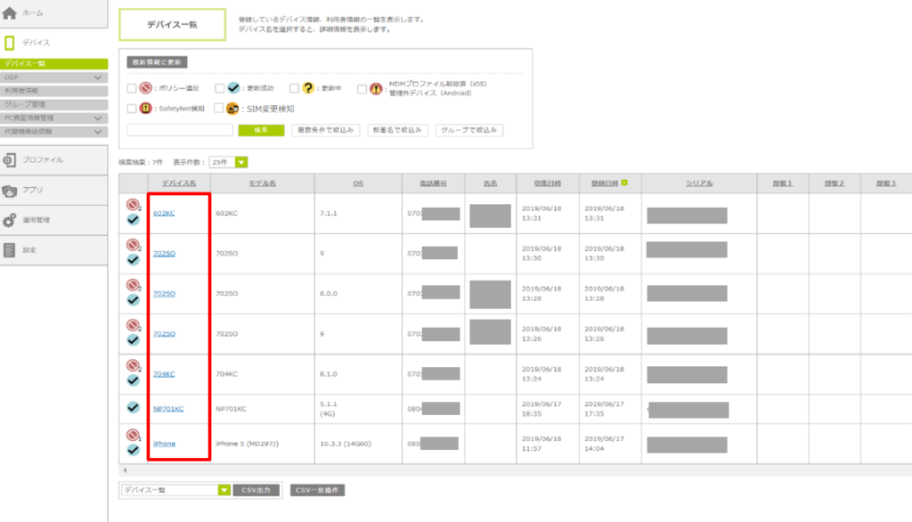 1. 「デバイス一覧」画面を表示し、パスワードリセットを実行したいデバイス名をクリックします。
