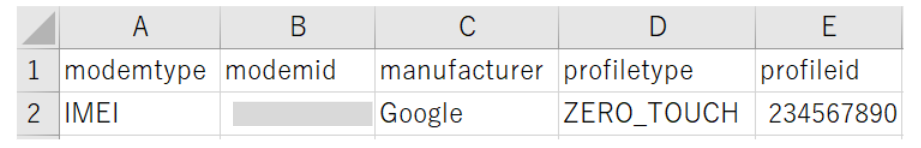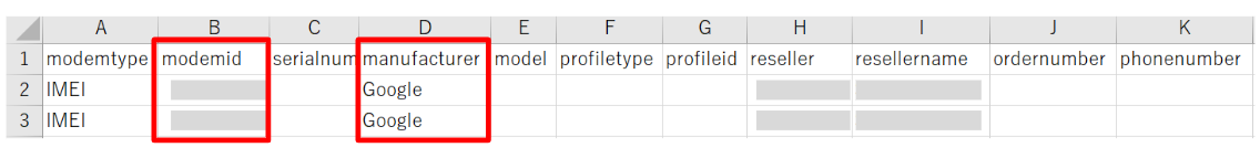 アップロードCSV作成時に「modemid」欄に記載されているIMEIと「manufacturer」欄に記載されているメーカー情報の値をCSVに記入します。
