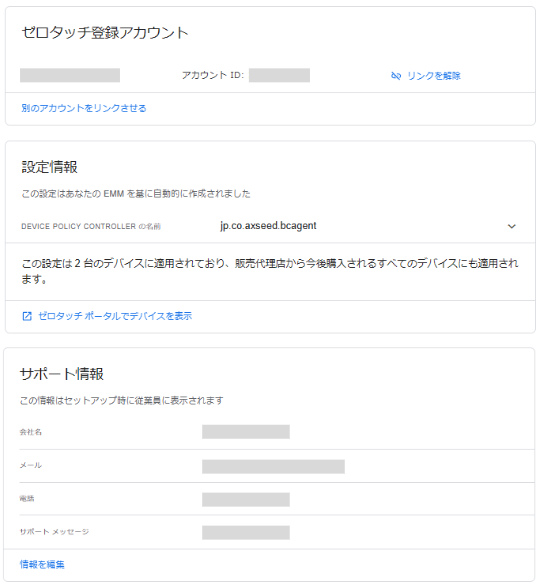 8.ゼロタッチ登録の設定情報やサポート情報を確認できる画面に遷移します。