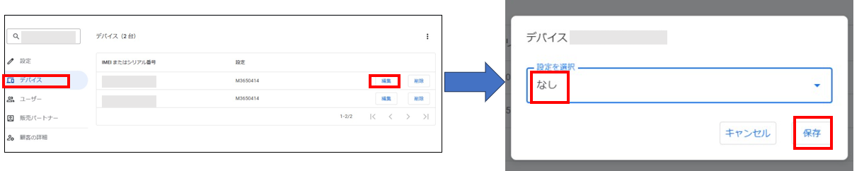 ・MDMファイルを解除する場合は、「デバイス」から該当デバイスの「編集」をクリック後、「なし」を選択し、保存してください。