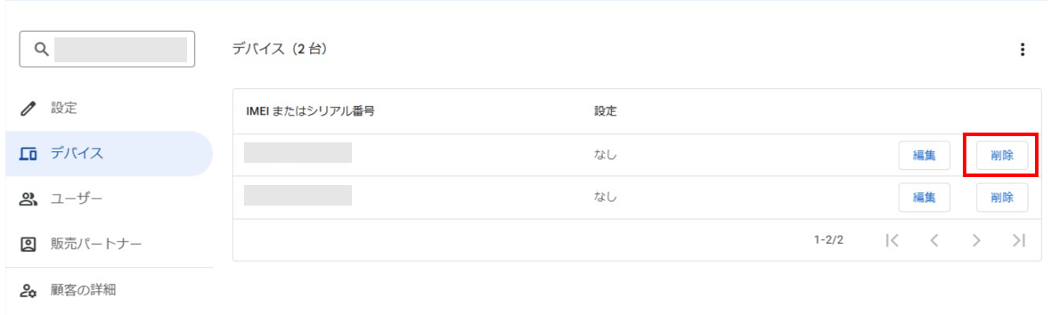・一度、「削除」をクリックしてIMEI情報を削除してしまうと、お客さまにて再度同じIMEI情報を登録することができません。