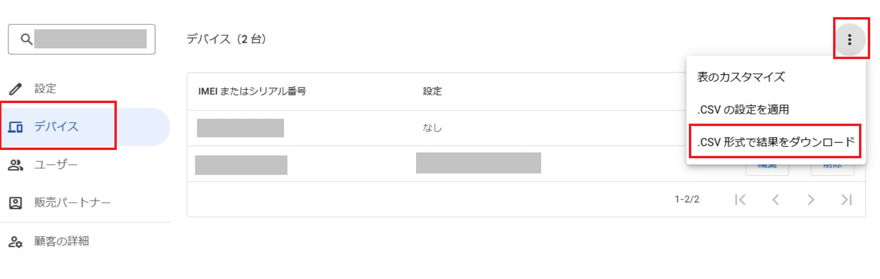 「 ︙ 」を選択し、「.CSV形式で結果をダウンロード」をクリックします。「devices.csv」がダウンロードされます。
