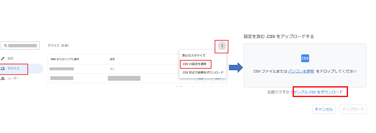 「 ︙ 」を選択し、「.CSVの設定を適用」をクリックし、サンプルCSVをダウンロードします。