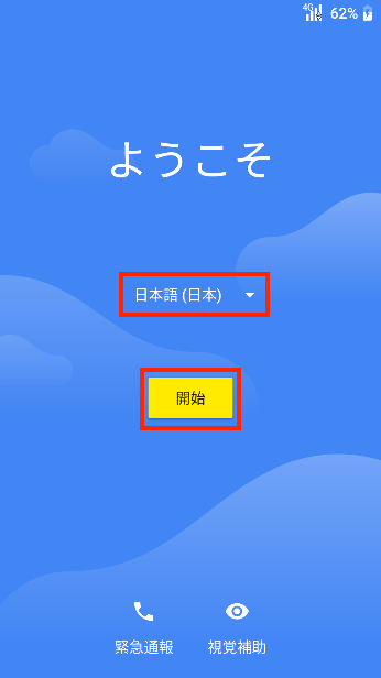 1.デバイスで使用する言語を設定し、「開始」をタップします。