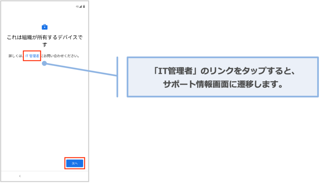 3.「これは組織が所有するデバイスです」の画面が表示されます。「次へ」をタップします。