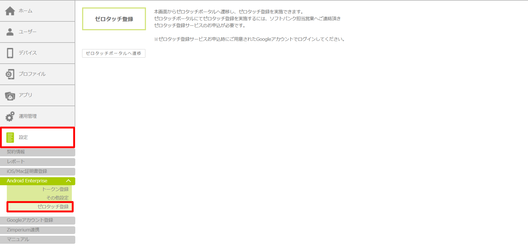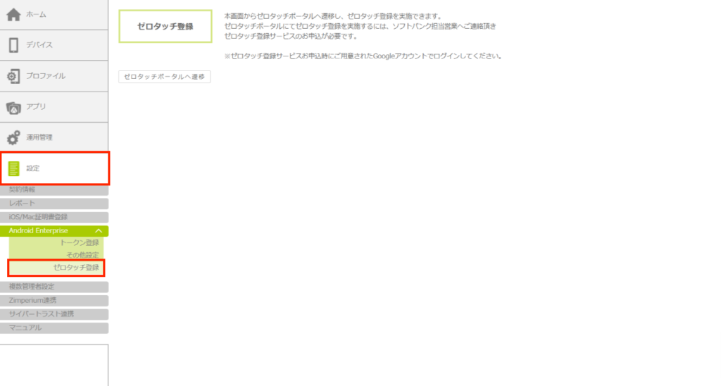 1.「設定」をクリックし、[Android Enterprise] – [ゼロタッチ登録]の順にクリックします。