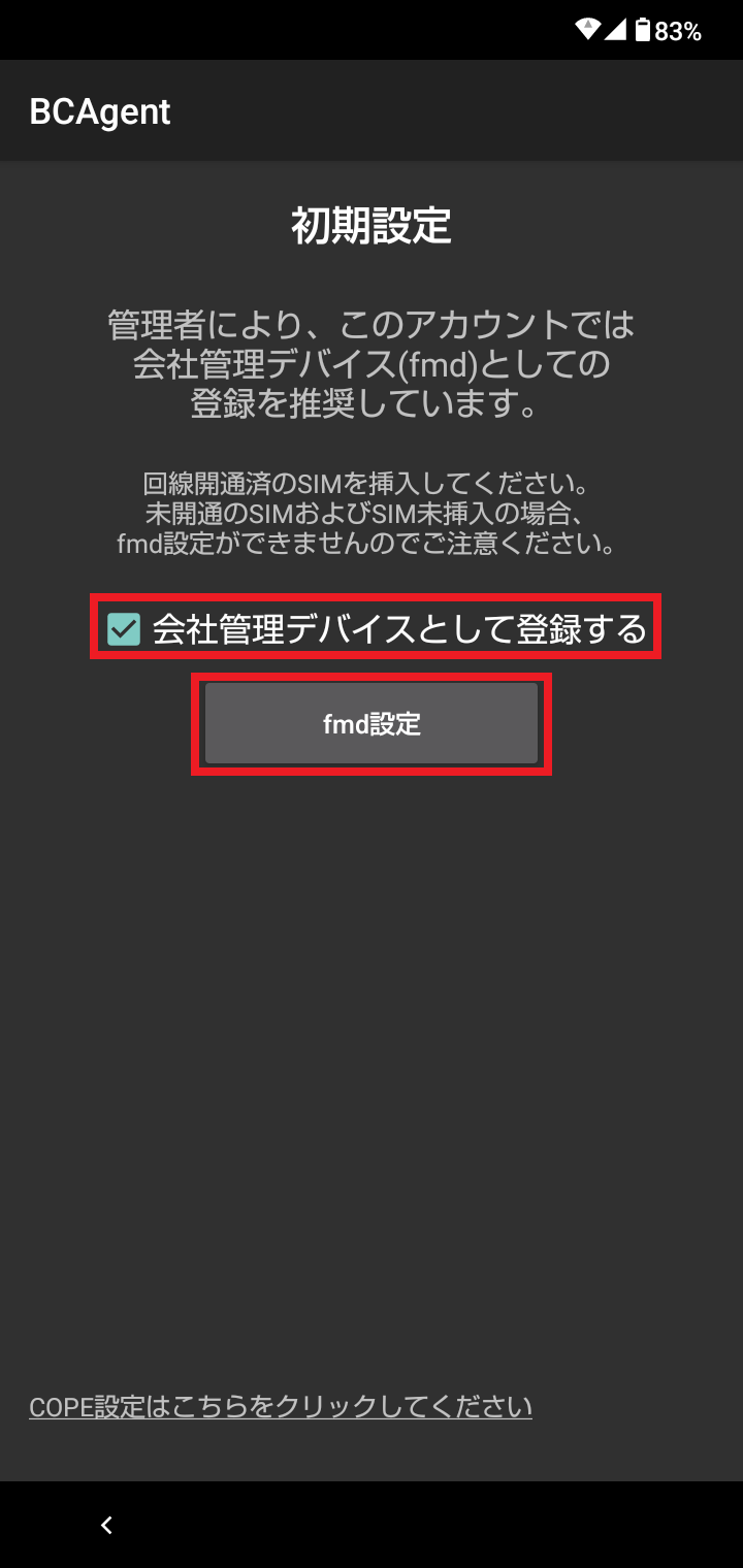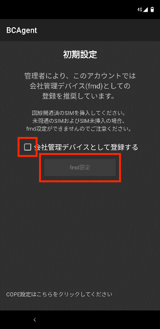 4.初期設定画面が表示されます。「会社管理デバイスとして登録する」にチェックを入れ、「fmd設定」をタップします。