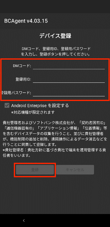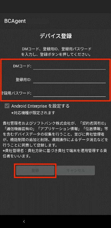7.デバイス登録画面が表示されます。DMコード、登録用ID、パスワードを入力して「登録」ボタンをタップします。