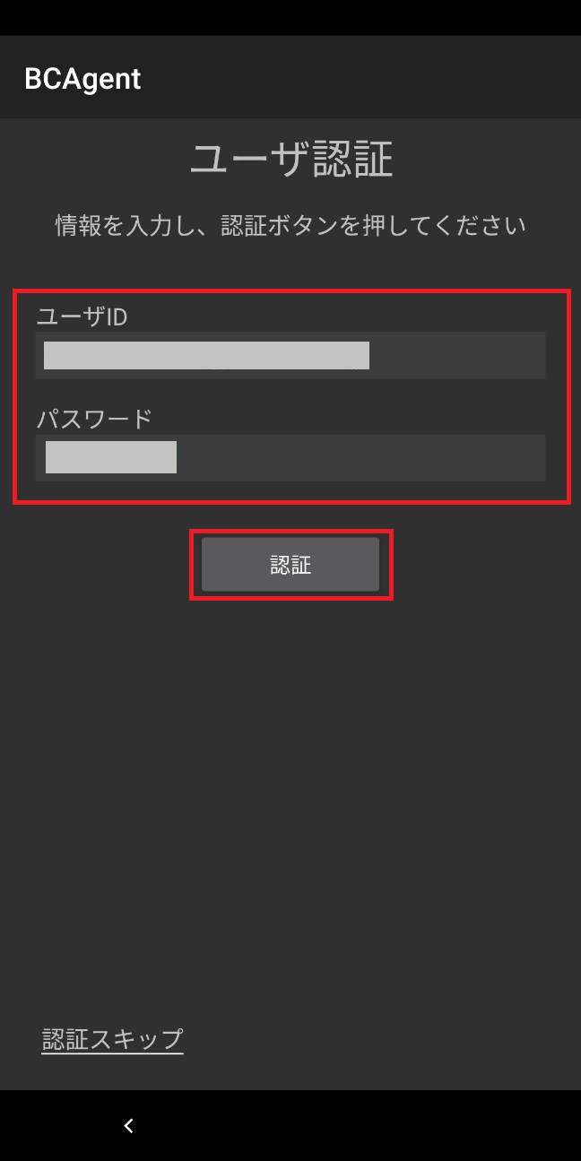 13.「ユーザ認証」画面が表示されたら、「ユーザID」、「パスワード」を入力し、「認証」をタップします。