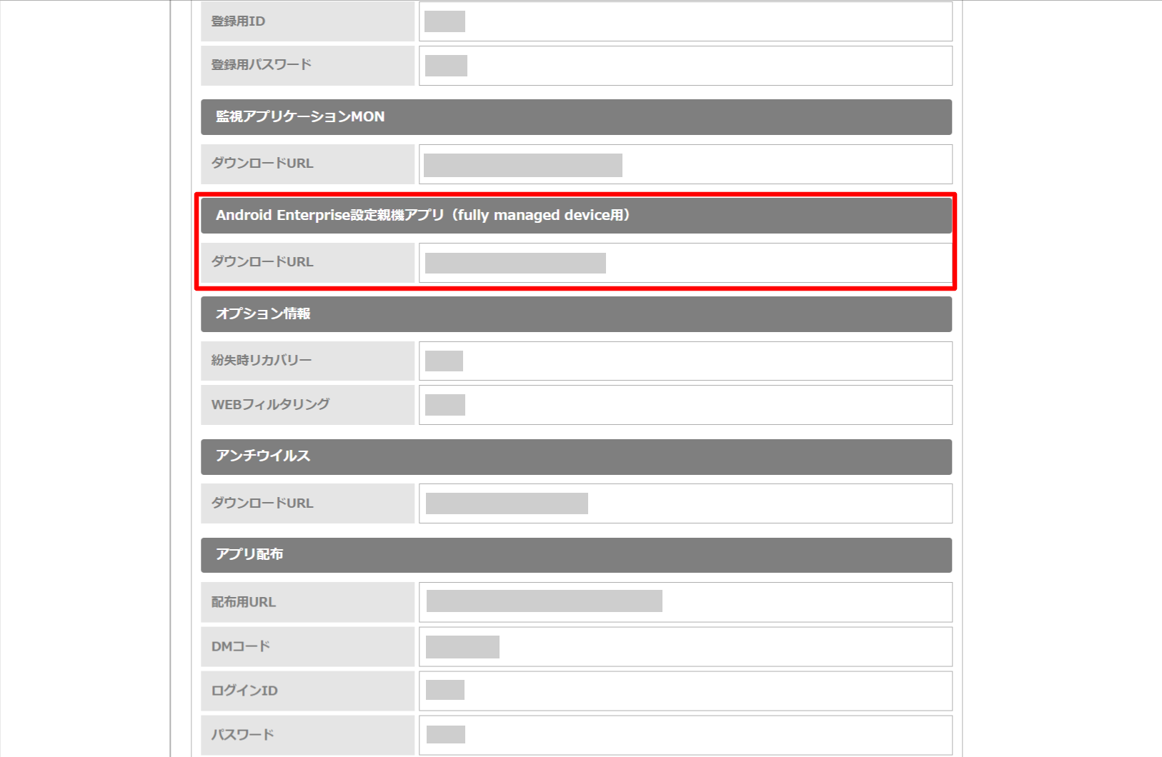 2.「Android Enterprise設定親機アプリ(Fully managed device用)」の「ダウンロードURL」を確認します。