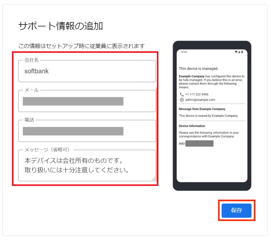 7.会社名、メールアドレス、電話番号、メッセージ(省略可)を入力して「保存」ボタンを押下します。