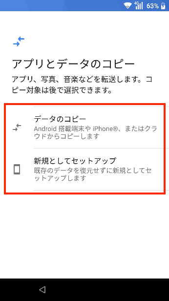 3.別のデバイスやクラウドからアプリなどのデータをコピーするかどうかを選択します。