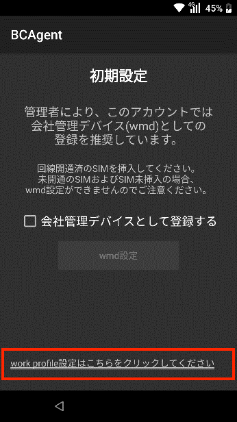 11.「初期設定」画面が表示されたら、「work profile設定はこちらをクリックしてください」をタップします。