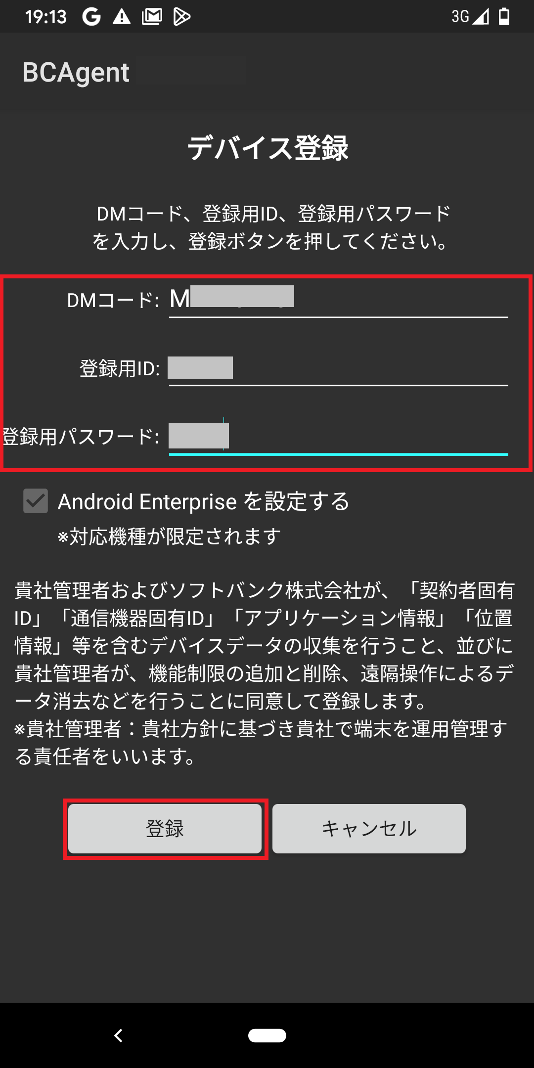 5.「デバイス登録」画面が表示されたら、「DMコード」、「登録用ID」、「登録用パスワード」を入力し、「登録」をタップします。