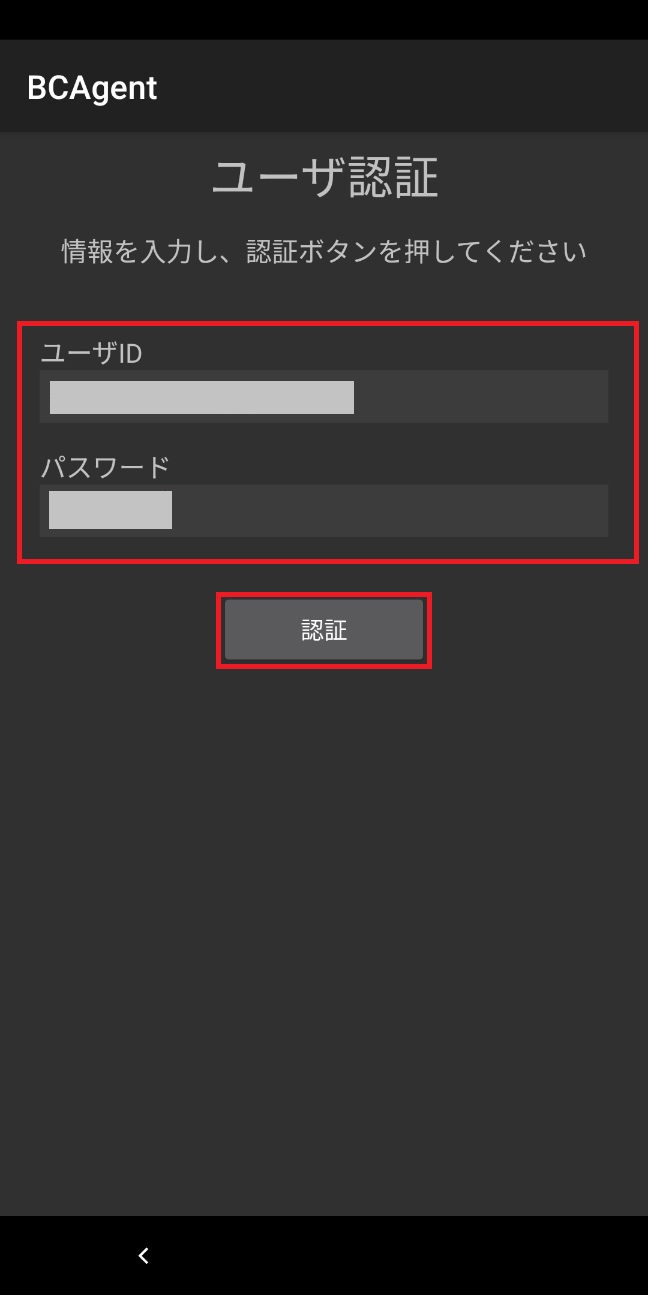 7.「ユーザ認証」画面が表示されたら、「ユーザID」、「パスワード」を入力し、「認証」をタップします。