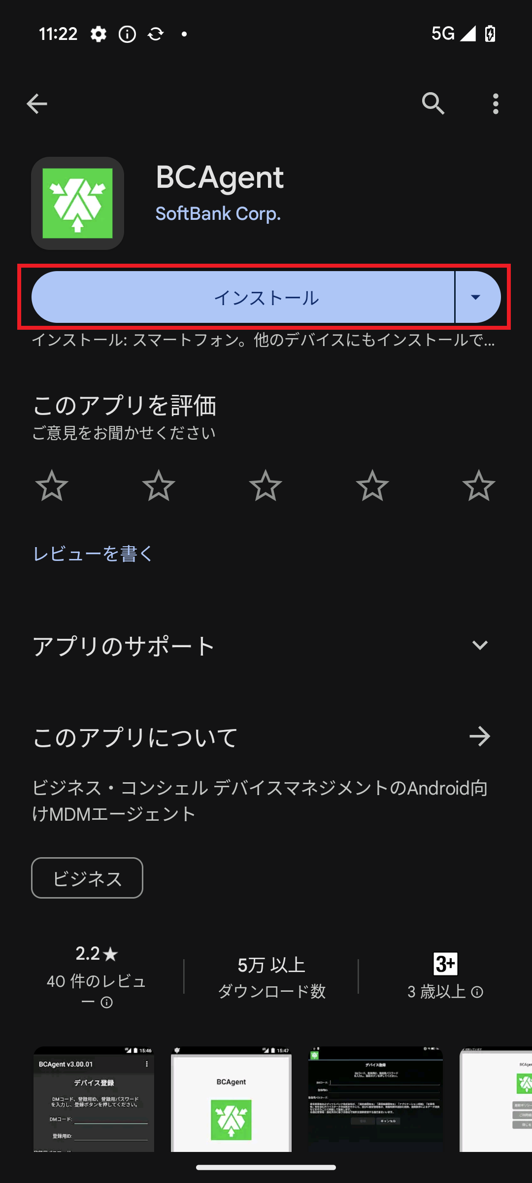 1.Playストアで「BCAgent」を検索し、「インストール」をタップします。