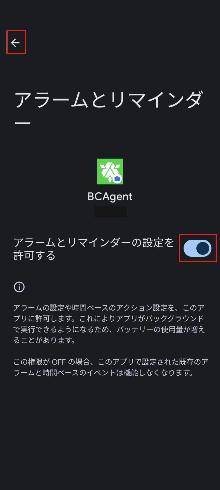 14.「アラームとリマインダーの設定を許可する」を「ON」にし、「戻る」をタップします。