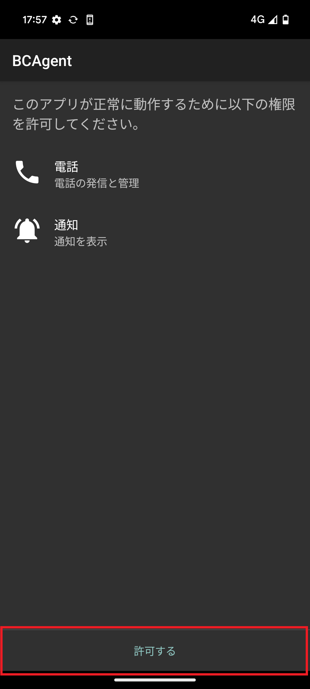 15.アクセス許可を求める画面が表示されたら、「許可する」をタップし、「BCAgent」をタップします。