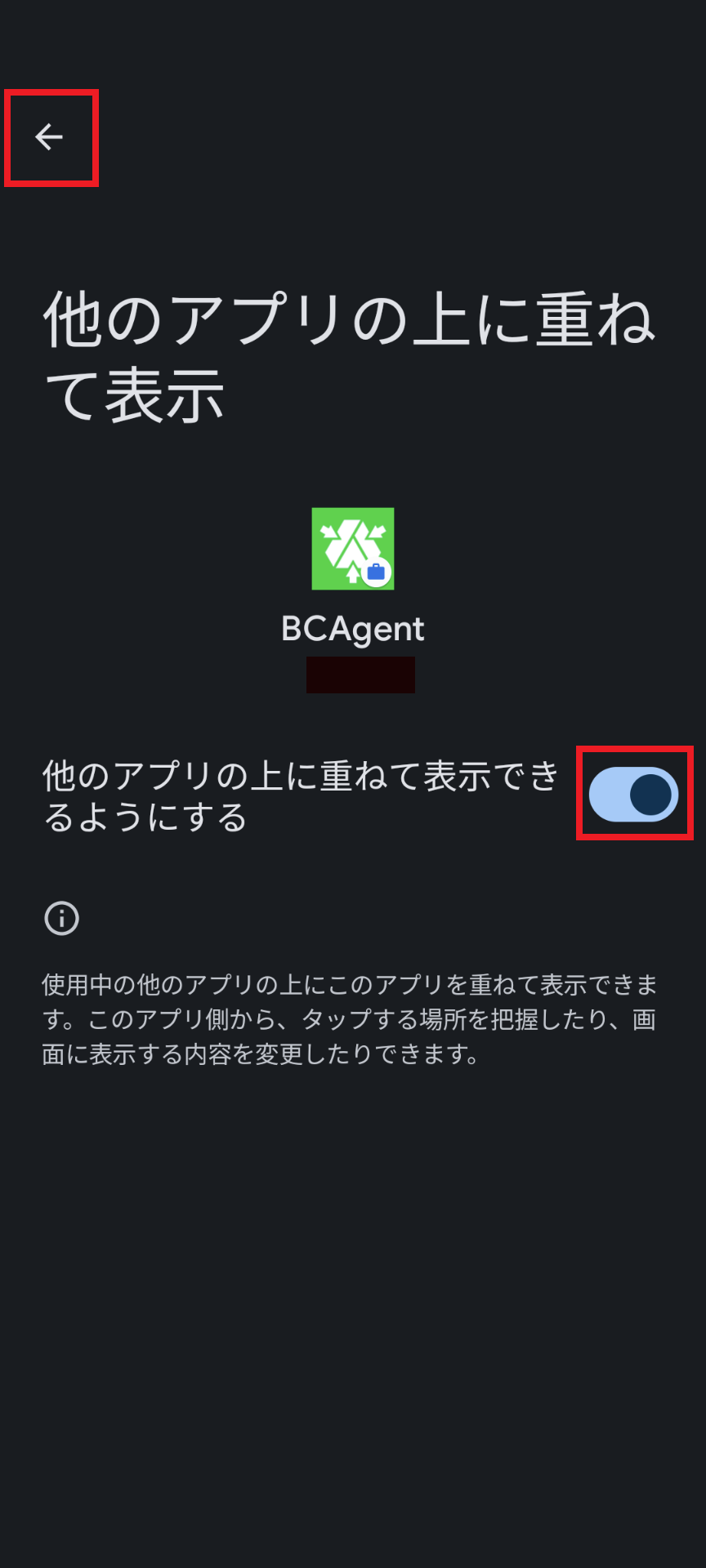 10.「他のアプリの上に重ねて表示できるようにする」を「ON」にし、「戻る」をタップします。