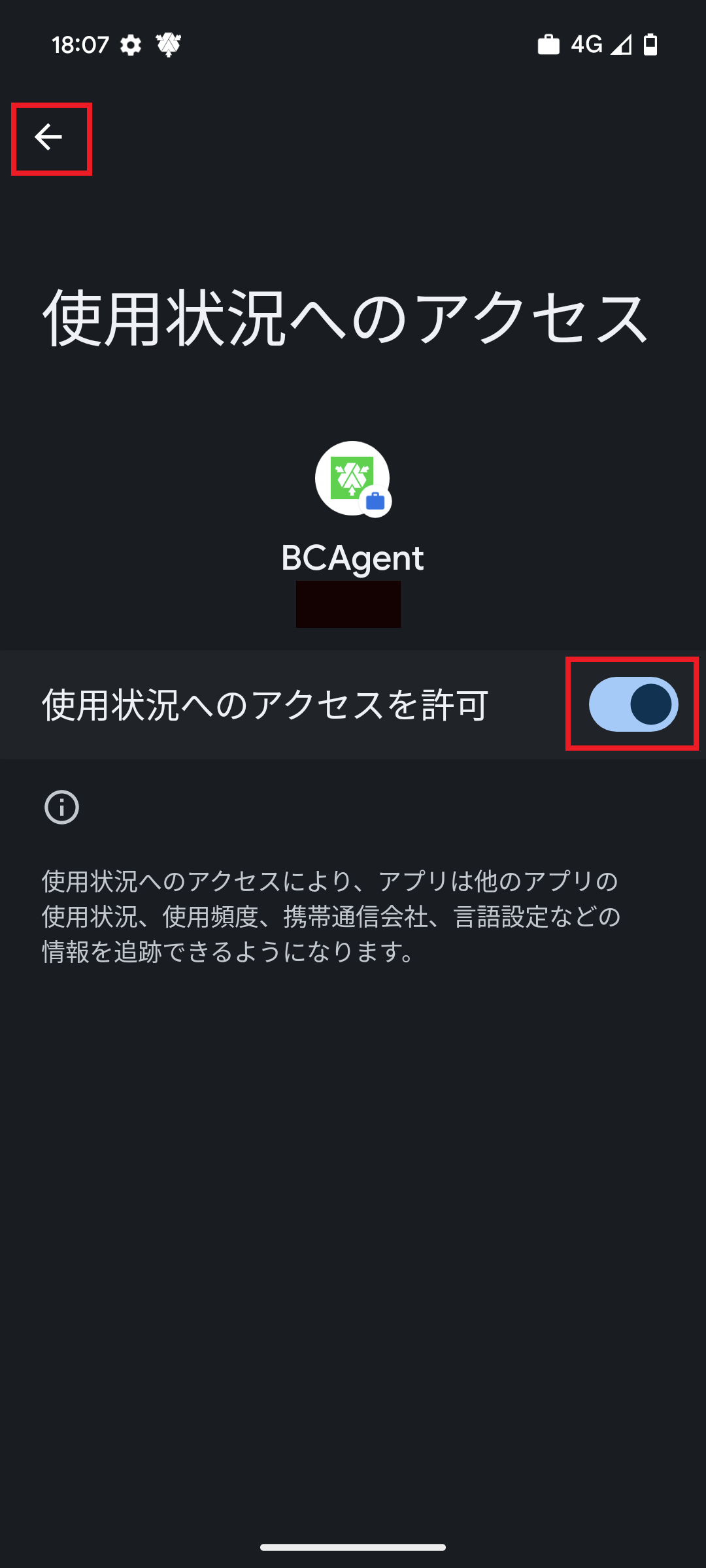 11.「使用状況へのアクセスを許可」を「ON」にし、「戻る」をタップします。