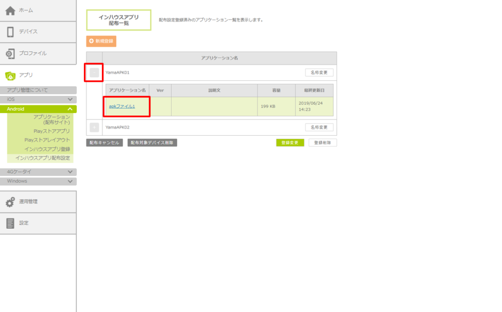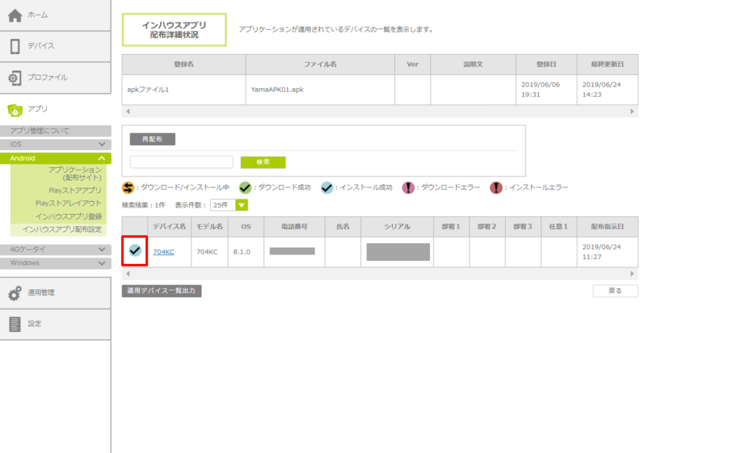 3.対象デバイスのステータスアイコンで、インハウスアプリの配布状態を確認します。
