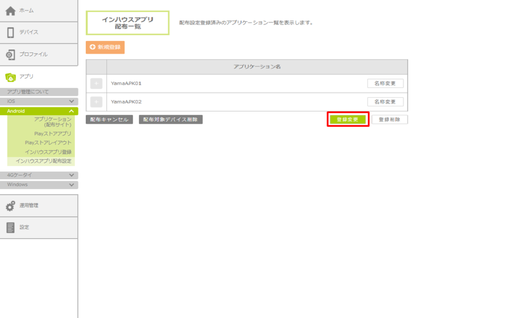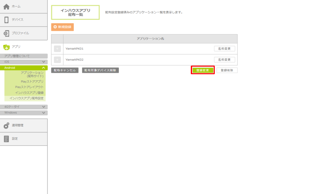 「インハウスアプリ配布登録変更」画面が表示されます。