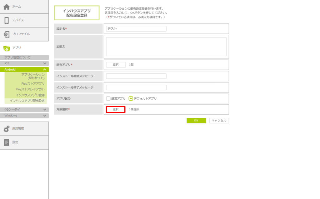 ・「アプリ区分」が「デフォルトアプリ」の場合は、「対象選択」の「選択」ボタンをクリックします。「割当対象選択」画面が表示されたら、追加で配布したいデバイスにチェックを入れ、「OK」ボタンをクリックします。