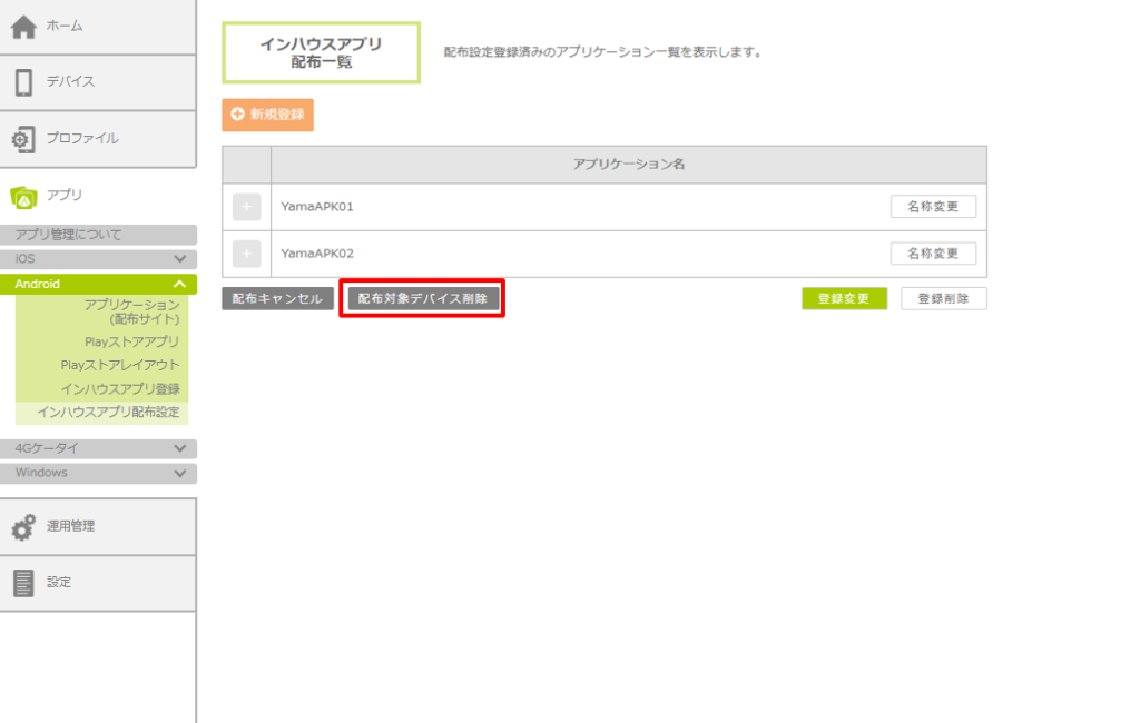 ・インハウスアプリの配布設定が「デフォルトアプリ」の場合、配布の割当対象から外れているデバイスは一覧に表示されないため、削除することはできません。