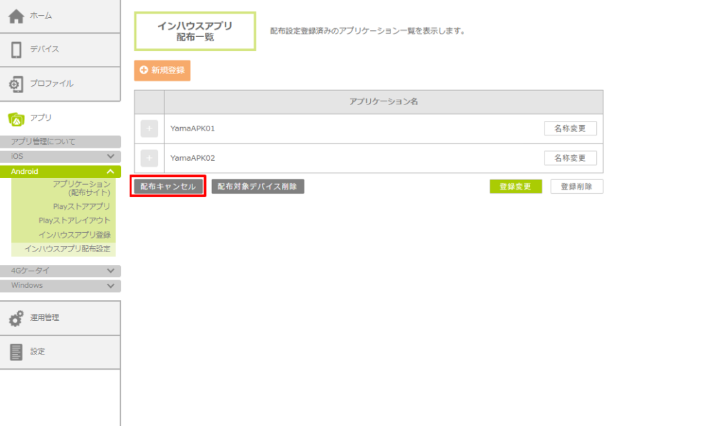 ここでは、インハウスアプリの配布をキャンセルする方法を説明します。また、配布エラーとなった場合の対応として、インハウスアプリを再配布する方法を説明します。