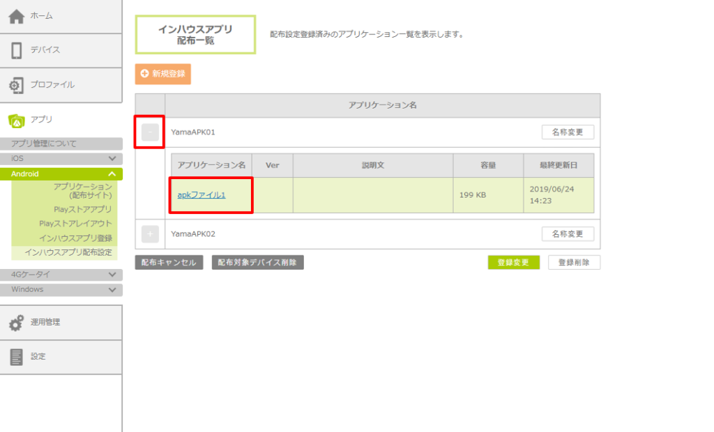 2.「アプリケーション名」左の「+」をクリックし、再配布したいインハウスアプリをクリックします。