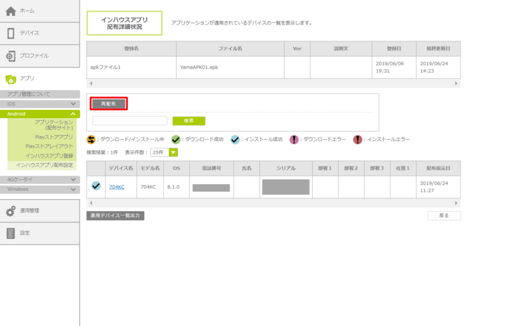 エラーなどによってインハウスアプリの配布が完了しなかったデバイスに対して、インハウスアプリ配布の指示を再度行います。