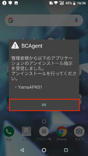1.デバイスに表示されるアンインストール通知で、「OK」をタップします。