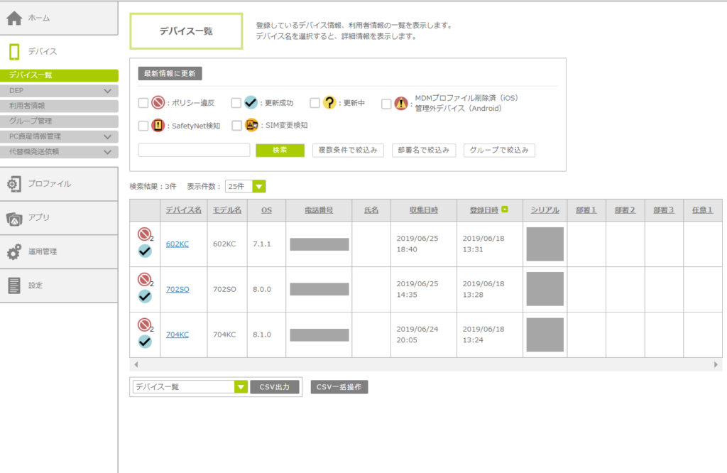 セキュリティポリシーのチェックが行われ、セキュリティポリシー違反があった場合は、「ダッシュボード」画面や「デバイス一覧」画面などの各画面に、ポリシー違反のステータスアイコンが表示されます。