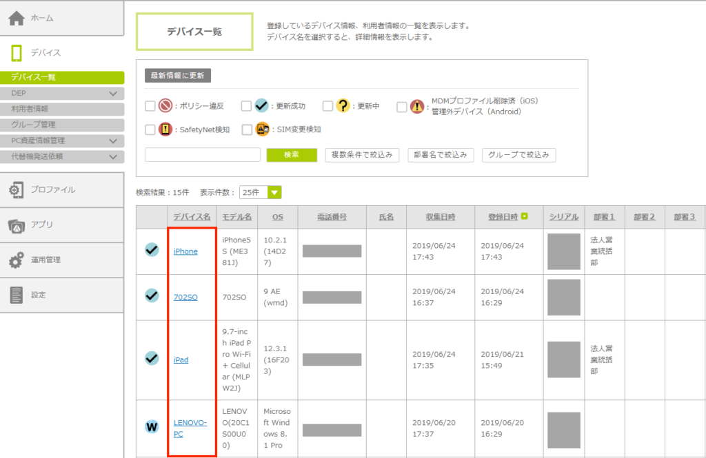 1.「デバイス一覧」画面を表示し、リモートロックを実行したいデバイス名をクリックします。