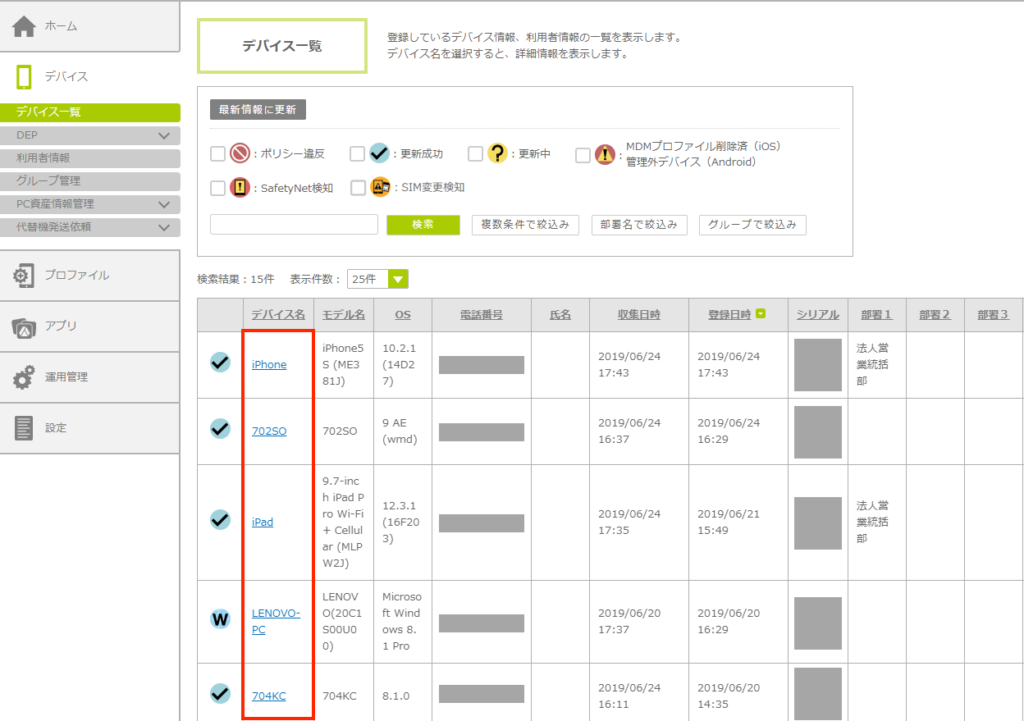 1.「デバイス一覧」画面を表示し、ロック解除を実行したいデバイス名をクリックします。