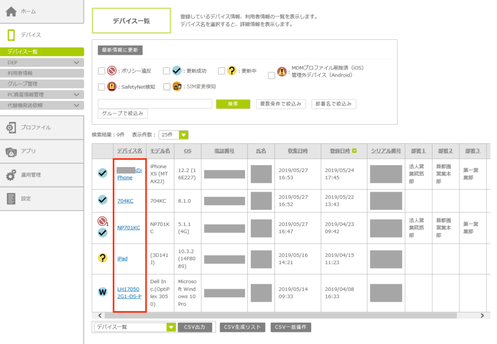 1.「デバイス一覧」画面を表示し、リモートワイプを実行したいデバイス名をクリックします。