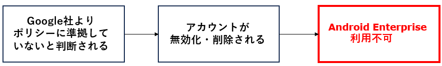 managed Google Play Account方式でデバイス管理いただく場合に取得いただく無料Gmailアカウントは、Google社の利用規約に基づき、Google社よりポリシーに準拠していないと判断された場合、Google社にてアカウントが凍結・削除されてしまうことがあります。