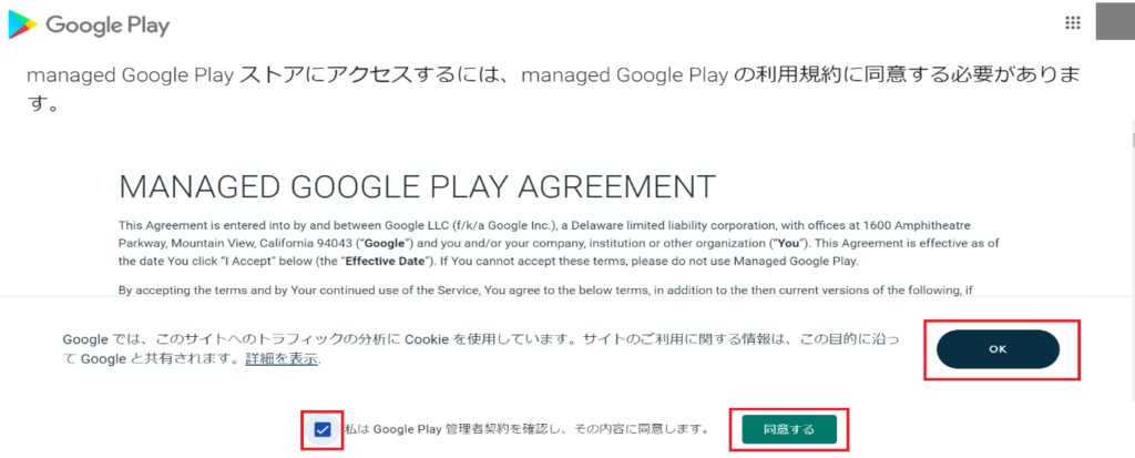 11.managed Google Play契約の内容を確認し、同意する場合はチェックを入れて、「確認」ボタンをクリックします。