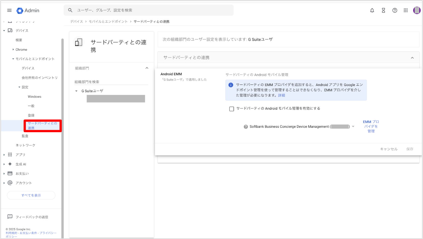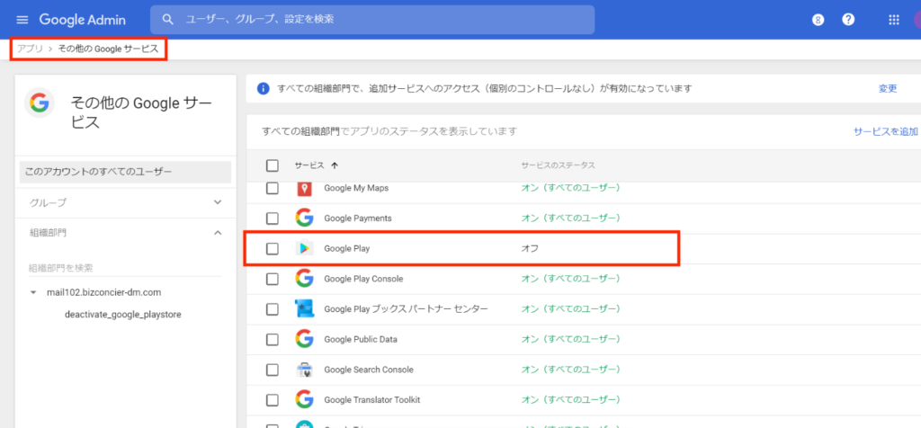 Managed Google Domains 方式へのアップグレード前の注意事項 ・アップグレードに使用したGoogle Workspace アカウントのメールアドレス、またはビジネス用のお客さまドメインのメールアドレスは、アップグレード後にBCDMの管理画面に反映されないため、お客さまにて管理していただく必要がございます。 ・アップグレード後に Google 管理コンソール上のサードパーティーの連携の設定を変更しないでください。設定を変更すると、Google Play アプリの配布や設定が期待通りに動作しない場合があります。