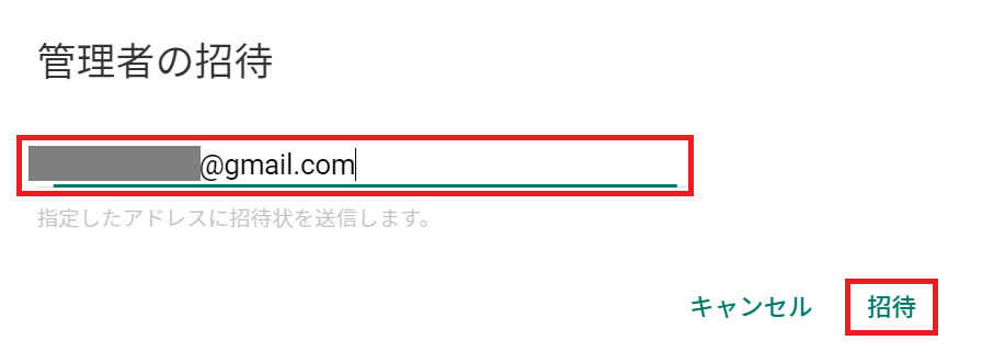 管理者として登録するアカウント(アカウントB)を入力し、[招待]を押下します。