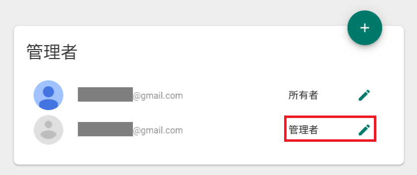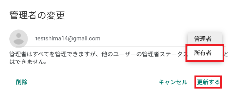 アカウントBの権限を[管理者]から[所有者]に変更します。