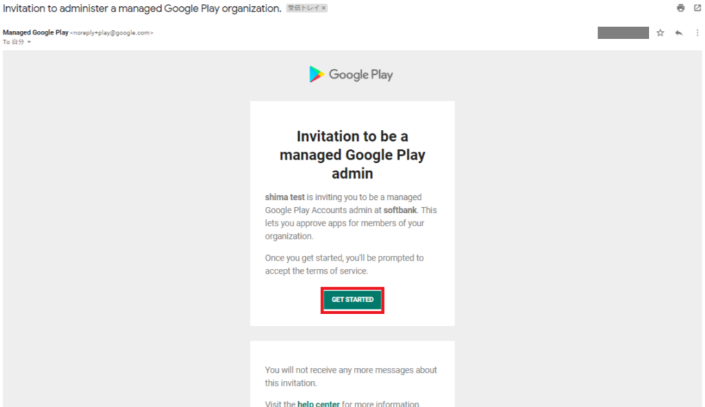 Managed Google Playよりメールが届きますので、[GET STARTED]を選択すると招待の受け入れ確認が行われます。