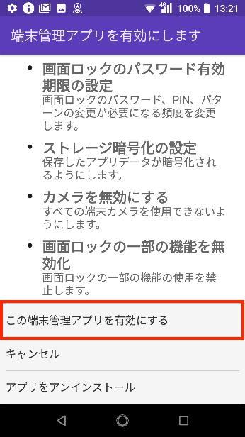 6.内容を確認し、「この端末管理アプリを有効にする」をタップします。